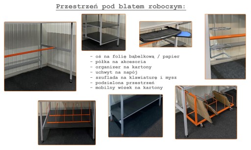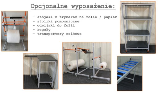 Dostarczamy również wyposażenie takie jak: wózki na kartony, wózki na folię bąbelkową lub papier pakowy, owijarki palet w folię stretch, stoły do pakowania, stoły montażowe, stoły do kompletacji, transportery rolkowe, regały wspornikowe stacjonarne, regały wspornikowe mobilne jedno i dwustronne.