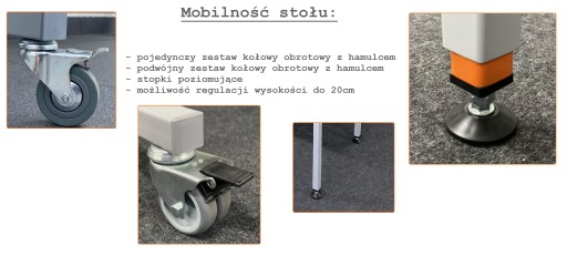 Stoły i stojaki wykonane są z profili stalowych, które zostały trwale zabezpieczone za pomocą lakierowania proszkowego, krawędzie profili wypełnione są zatyczkami PVC.