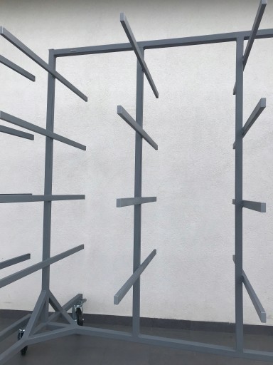 Wózek wspornikowy wykonany jest z zamkniętego profilu stalowego, który został zabezpieczony farbą antykorozyjną ( istnieje możliwość również malowania proszkowego ), ostre krawędzie profili zabezpieczone są zatyczkami z PVC w każdym profilu. Wózek posiada skrętne koła, które mogą być wyposażone dodatkowo w hamulec blokujący. Wielkość kół oraz komponent, z którego są wykonane koła dostosowany jest w zależności od ciężaru przechowywanego na stojaku towaru oraz podłoża, po którym będzie się poruszał.