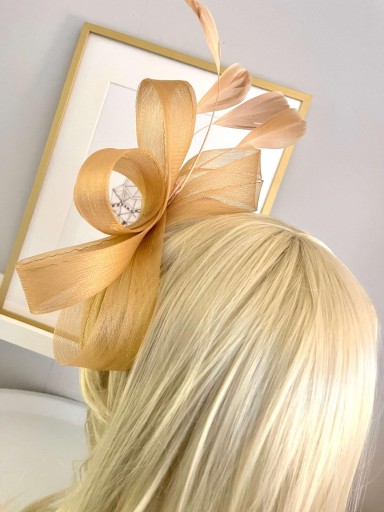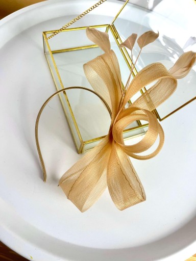 Ozdoba w formie kokardy z dodatkiem piórek.