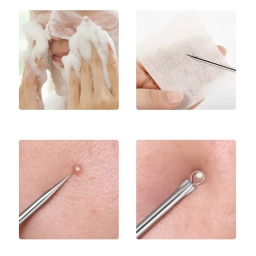 - Przykładamy odpowiednią unny tak, by zaskórnik, wągr znalazł się w środku - delikatnie przyciskamy skórę, co sprawi, że wągr zostanie wyciśnięty do góry. Szpikulcem nakłuwamy większe zmiany