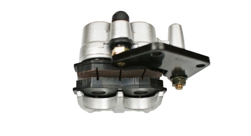 Kompletny zacisk hamulcowy. Całość jest wykonana z odpornego na uszkodzenia aluminium.
