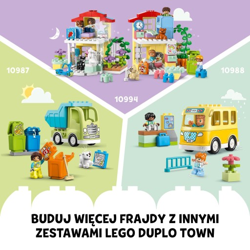 Zestawy konstrukcyjne LEGO Town pomagają przedszkolakom poznawać otaczający je świat i odgrywać role z współczesnego życia. Podobnie jak wszystkie zabawki LEGO DUPLO, ten zestaw jest pełen różnorodnych możliwości edukacyjnych. Poręczne klocki w jaskrawych kolorach i zabawne ruchome części stymulują zmysły dzieci i pomagają im rozwijać umiejętności motoryczne.