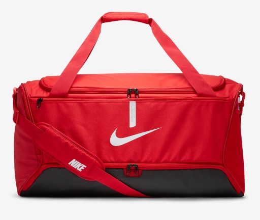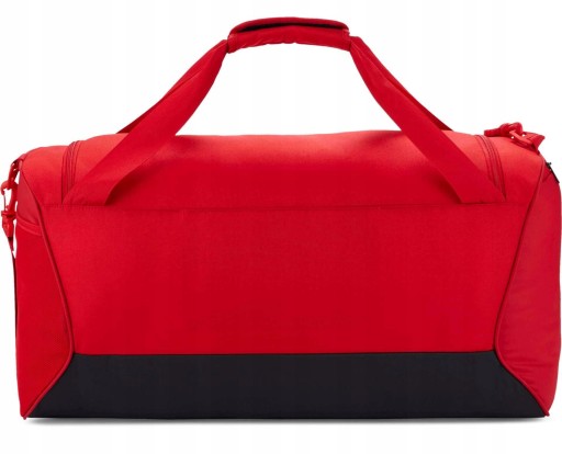 Torba treningowa Nike w pięknym czerwonym kolorze z subtelnym logo producenta na pasku oraz na przodzie. Stworzona została z wytrzymałego poliestru w klasycznym designie. Komora główna z mniejszą kieszonką zapinaną, umożliwią organizację oraz odseparowanie drobnych przedmiotów. Model został wyposażono w długi regulowany pas z ochronną nakładką na ramię oraz dwie krótsze rączki do swobodnego przenoszenia torby w dłoniach. Torba Nike to idealna propozycja spakowania niezbędnych rzeczy na trening lub krótki wyjazd, jej pojemność to aż 60 litrów. Posiada dwie zewnętrzne kieszenie boczne, w tym jedną siateczkową, która pozwala odseparować np. wilgotny T-shirt. Dodatkowo torba wyposażona została w kieszeń dolną, która jeszcze bardziej ułatwia dbanie o organizację i rozdzielanie przedmiotów. Torba posiada wodoodporny materiał na spodzie, który chroni przed dostawaniem się wilgoci do środka i ułatwia czyszczenie materiału.