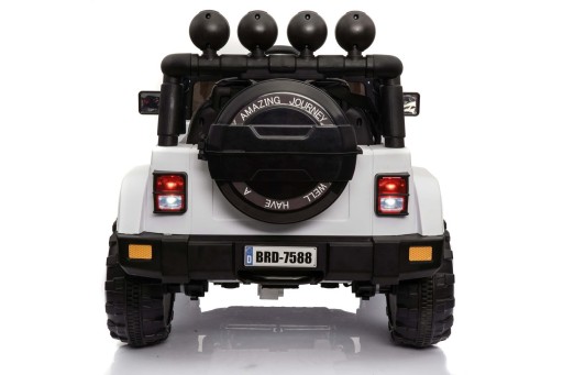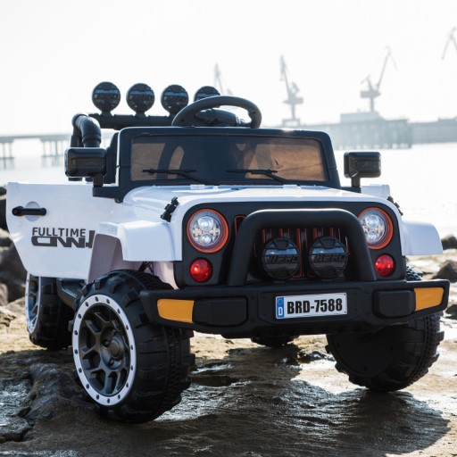 AUTO MEGA JEEP FULLTIME Z NAPĘDEM 4X4 z systemem ESW - system wolnego startu, hamulcem oraz z kołami EVA i miękkim siedzeniem zasilane na 12 V z napędem na cztery koła zachwyci nie jednego przyszłego kierowcę. Dzięki zastosowanym najmocniejszym silnikom 45 W, auto jeździ po nierównym terenie bez żadnych problemów - posiada olbrzymie miękkie koła EVA, Najciekawszą funkcją pojazdu jest SYSTEM WOLNEGO STARTU, oraz SYSTEM HAMOWANIA Z PILOTA Z FUNKCJĄ BLOKADY JAZDY MANUALNEJ Ciekawym elementem jest oświetlenie pojazdu - świecące światła przednie i tylne.Duże koła EVA zapewniają cichą jazdę. Podświetlana deska rozdzielcza pojazdu oraz wskaźnik naładowania akumulator z nowoczesnym panelem z wejściem MP3, slotem na kartę i wgranymi piosenkami dają pełen komfort użytkowania pojazdu - wiemy na jak długo mamy jeszcze " paliwa" ( napięcia w akumulatorach). Nowoczesny panel daje możliwość odgrywania utworów z urządzeń zewnętrznych oraz sterowania nimi za pomocą przycisku na kierownicy.
