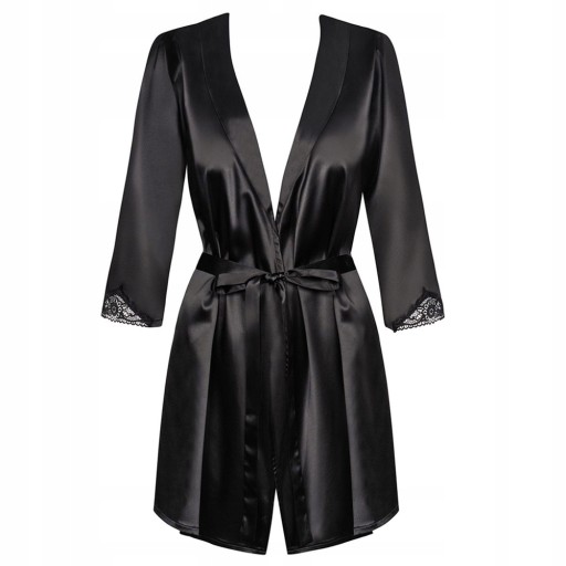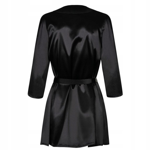 Satinia S/M to satynowy czarny peniuar marki Obsessive wykonany z połyskującego materiału i delikatnej koronki. Elegancki i kobiecy, wiązany w pasie satynową tasiemką. Podkreśla figurę, świetnie dopasowuje się do sylwetki i optycznie wyszczupla. Uniwersalny krój sprawia, że w szlafroku Satinia każdy rodzaj figury będzie prezentował się zjawiskowo. Rękawy o długości 3/4 posiadają ozdobne wstawki z czarnej gipiury, które dodatkowo zdobią i dodają kobiecości.