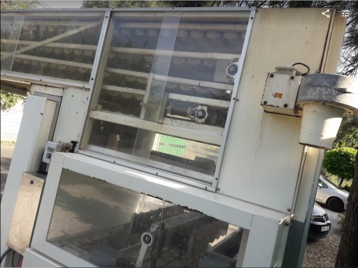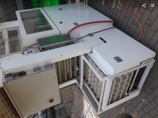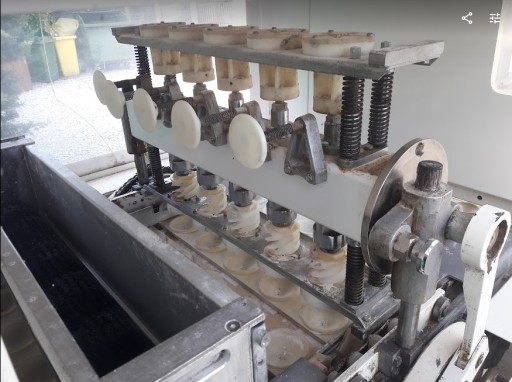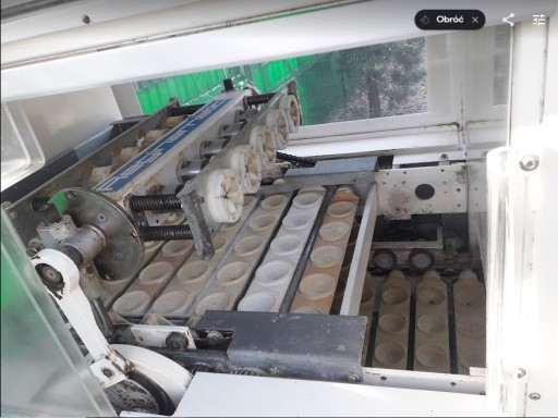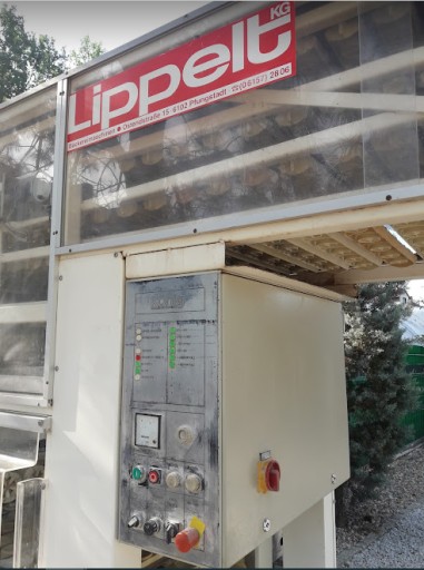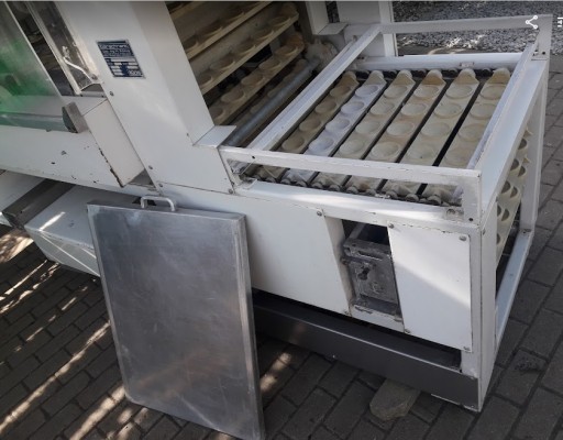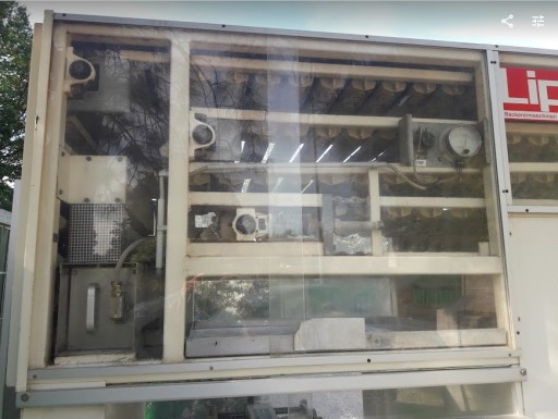 Linia garownicza LIPPELT ECO 4000 , do produkcji bułek. Automatyczne dobieranie wody. Regulacja temperatury i wilgotności. Ma około 300 kołysek. Niemiec miał mniejsze blachy, dlatego maszyna zrzucała 7 kołysek. Maksymalnie może obrócić 9 kołysek. 2 brakujące koła, które powodują obrót, są w komplecie. Trzeba tylko dołożyć krótki łańcuch napędowy, do zębatki napędzającej te 2 odpięte koła. Dla oszczędności Niemiec również odłączył wentylator, ten po prawej u góry. Wymiar zewnętrzny około 300 x 100 x 260cm wysokość. Cicha i ładna praca. Możliwość podłączenia dzielarki do bułek.