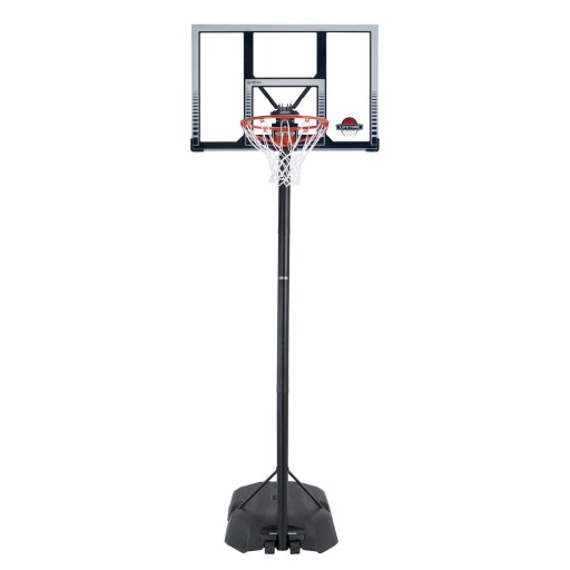 Przenośny stojak do koszykówki posiada 44" tablicę wykonaną w technologii Steel-Framed Shatter-Proof. Technologia Shatter-Proof gwarantuje wieloletnią trwałość i odporność na uderzenia dzięki powłoce z najwyższej jakości poliwęglanu Makrolon®. Steel-Framed to wytrzymała stalowa rama tablicy. Dodatkowo ochrona dolnej krawędzi tablicy oraz technologia regulacja wysokości tablicy Quick Adjust® II zapewniają komfortową i bezpieczną grę na każdym poziomie zaawansowania, dzięki regulacji w zakresie od 244 do 300 cm. Całość uzupełnia wytrzymała obręcz posiadająca elastyczny, uchylny mechanizm Slam-It® oparty na systemie podwójnych sprężyn oraz odporna na warunki atmosferyczne nylonowa siatka i okrągły słup o średnicy 7,6 cm. Rolki transportowe zamontowane w wypełnianej wodą lub piaskiem stabilnej podstawie o pojemności 128 litrów zapewniają pełną mobilność a zarazem stabilność stojaka.