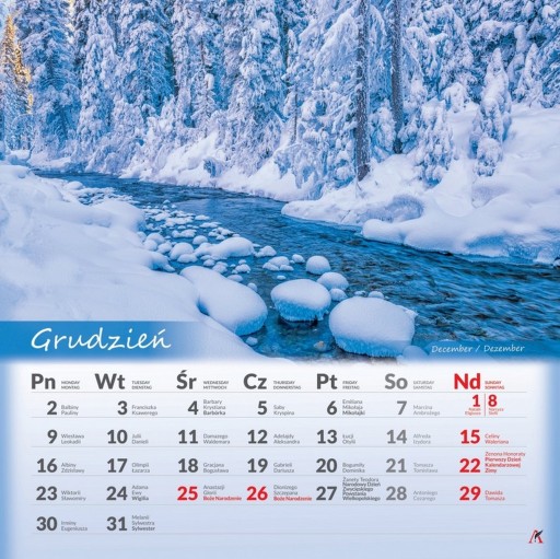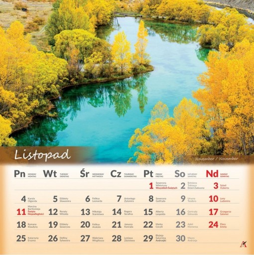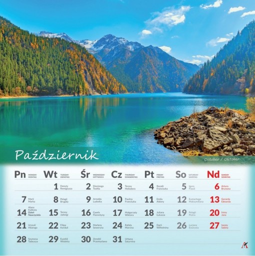 Wyraźna, tłusta czcionka miesiąca głównego, piękne zdjęcia i spiralka ułatwiająca przekładanie stron.