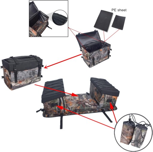 Funkcja siedziska - miękkie , z pianką w środku. Dodatkowo 2 pojemniki utrzymujące temperaturę cooler-y na napoje - mocowane na rzepy.