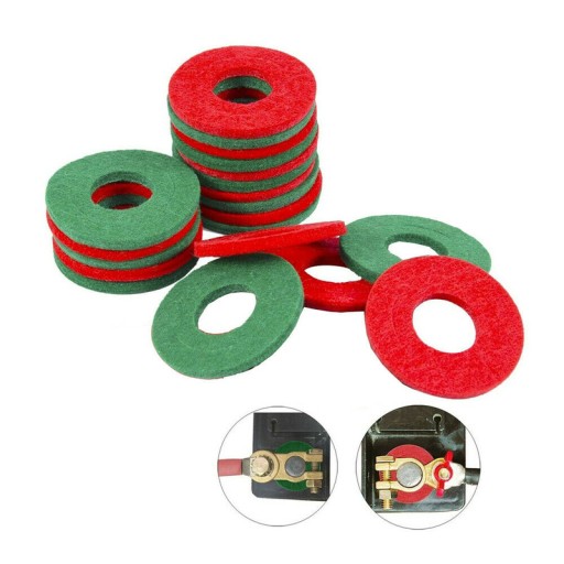 20 szt. Akumulator samochodowy Terminal Protector podkładki zacisk akumulatora antykorozyjna uszczelka podkładki filcowe uniwersalne akcesoria samochodowe Prevents corrosion around the battery terminals while increasing battery life Can be used on top post batteries or cables and side post batteries Inner ring can be removed to fit larger battery terminals Bag includes a total of 20 anti corrosion washers. 10 Green and 10 Red. Washer colors indicate positive and negative terminals: Red +, Green -
