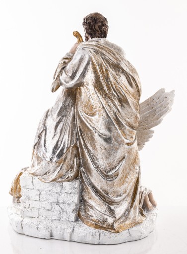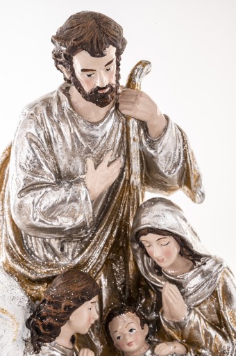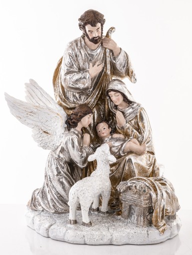 Przepiękna figura jako dekoracja świąteczna, przedstawia Świętą rodzinę z Aniołem i owcą. Figurkę wykonano z tworzywa sztucznego w kolorze srebrnym z dodatkiem złota i brokatu. Jest to także znakomity prezent dla bliskich.