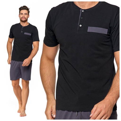 Wyjątkowa męska piżama bawełniana - krótka, rozpinana, z spodenkami. Funkcjonalność i styl spotykają się tutaj, by zapewnić Ci komfort na nowym poziomie. Krótka długość sprawia, że jest to doskonały wybór na cieplejsze noce. Rozpinana bluza to wygoda i swoboda, którą cenisz. Elastyczny pas spodenek zapewnia idealne dopasowanie, a wysokiej jakości bawełna sprawia, że poczujesz się świeżo i wygodnie. Uniwersalny design sprawia, że ta piżama jest idealna jako strój nocny lub do domowego wypoczynku. Daj sobie luksus komfortu z naszą męską bawełnianą piżamą krótką, rozpinaną ze spodenkami.