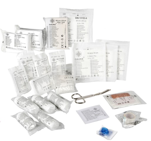 - Zawiera kompletne wyposażenie opatrunkowe niezbędne do udzielenia pierwszej pomocy w terenie, w czytelny sposób ułożone w foliowych przegrodach