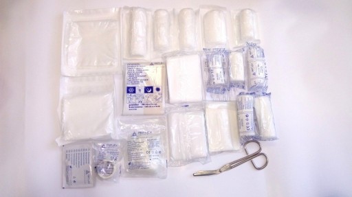 - Duża ilość opatrunków sterylnych, opasek elastycznych, plastrów, w tym sterylne opatrunki indywidualne typu „M" i „G" zawierające kompletny opatrunek wraz z kompresem, którym poszkodowana osoba bez trudu może opatrzyć się sama
