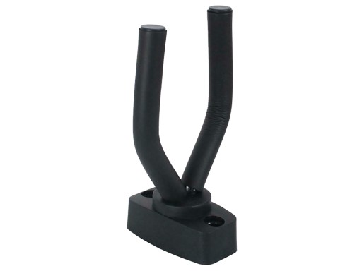 Przeznaczony do montażu na ścianę w zestawie znajdują się 2 śruby i 2 kołki montażowe. Posiada metalowe ramiona obszyte miekką gąbką chroniącą sprzęt przed zarysowaniem i uszkodzeniem. Hak jest regulowany,najszerszy rozstaw to ok 4,5cm, dostosowuje się do szerokości gryfu.