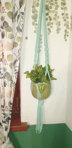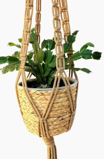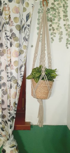 Kwietnik ze sznurka bawełnianego, o grubości 5 mm, zakończony drewnianym kółkiem. Kolor kwietnika do wyboru z wzornika kolorów ( w przypadku braku informacji wysyłka losowa).