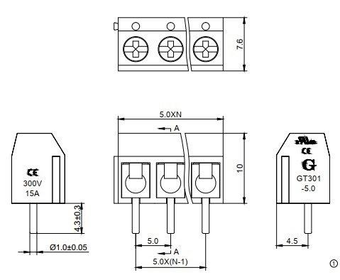 2 pola, raster 5mm, wys. 10mm, kolor niebieski, 300V, 15A