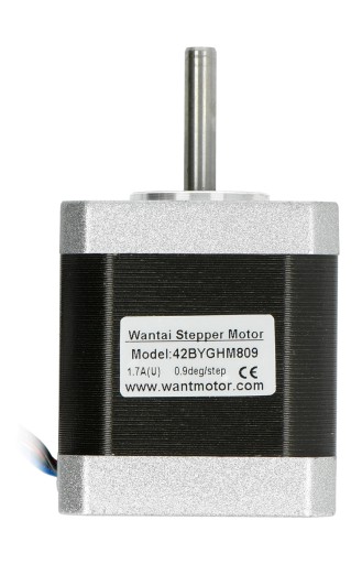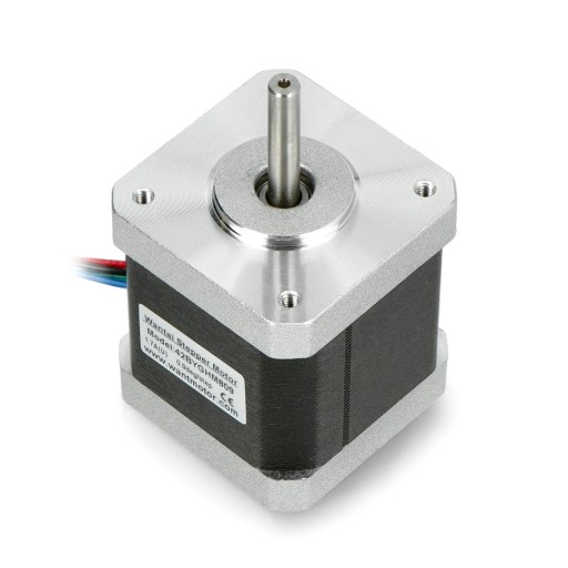 Silnik krokowy bipolarny, czteroprzewodowy. Posiada rozdzielczość 400 kroków na obrót (0,9 stopnia). Zasilany jest napięciem 3 V, pobiera prąd 1,7 A na cewkę. Moment trzymający wynosi 4,89 kg*cm (0,48 Nm). Wymiary: 42 x 42 x 48 mm - NEMA 17.