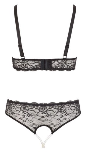 Delicate lace combined with decorative pearls! The wireless bra with a hook-fastener at the back, adjustable straps and pearl chains above the breasts definitely stands out from the rest. The G-string also has 2 pearl chains over the completely open crotch area. 90% polyamide, 10% spandex.