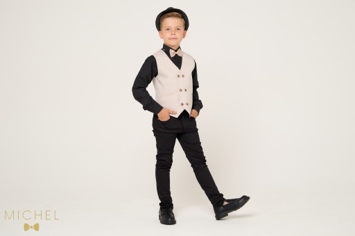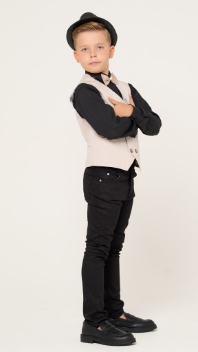 Elegancki komplet chłopięcy w kolorze beżowo-czarnym Gregory, idealny dla chłopców o wzroście 140 cm. Ten stylowy zestaw łączy w sobie nowoczesny design i klasyczną elegancję, zapewniając młodemu gentelmanowi wyjątkowy wygląd i komfort na każdą specjalną okazję.