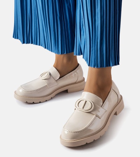 Beżowe lakierowane mokasyny Scranton są damskimi, nowoczesnymi i eleganckimi butami. Wykonane z tworzywa sztucznego, posiadają lakierowaną powierzchnię, która dodaje im modnego wyglądu. Buty mają wsuwany design, co sprawia, że są łatwe do założenia i zdejmowania. Ich okrągły nosek nadaje im klasycznego charakteru, a niski obcas zapewnia wygodę noszenia przez cały dzień. Te beżowe lakierowane mokasyny Scranton są idealne dla kobiet, które cenią sobie styl, elegancję i komfort.