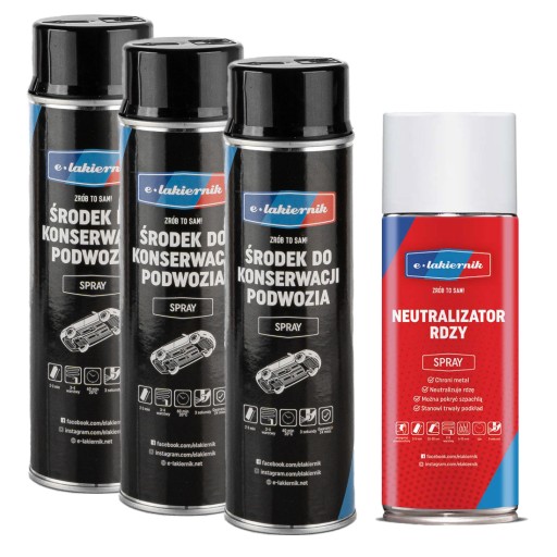 Przygotuj powierzchnię nadszarpniętą przez korozję i uzupełnij braki w konserwacji. Komplet złożony z 3 puszek Środka do Konserwacji Podwozia i jednej puszki Neutralizatora Rdzy.