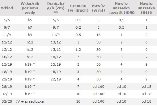 Tabela z zestawieniem akcesoriów do zestawu hydroponicznego