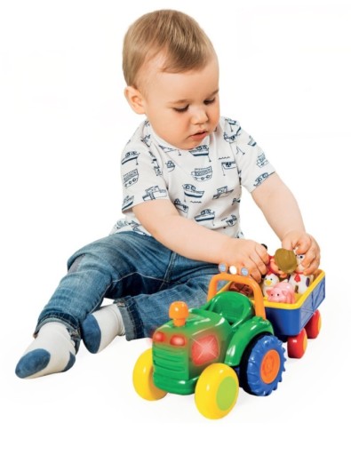 Traktor z przyczepą zawiera 5 zwierzątek, które nagrodzą dziecko realistycznym odgłosem lub wesołą rymowanką za każdym razem, gdy odgadnie ono prawidłowy kształt i włoży zwierzątko w odpowiednie miejsce. Po naciśnięciu komina traktor przez chwilę samodzielnie jedzie do przodu wydając realistyczny odgłos silnika. Po naciśnięciu fotela kierowcy rozlega się dźwięk wesołej melodyjki „farmer”. Gdy dziecko naciśnie kierownicę można usłyszeć dźwięk klaksonu a przednie światła zaczną mrugać.