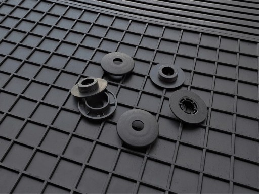 - Po dopasowaniu dywaników w samochodzie należy oznaczyć miejsca występowania wkrętów w podłodze auta, następnie wyciąć otwory w dywanikach, po czym zamontować stopery.