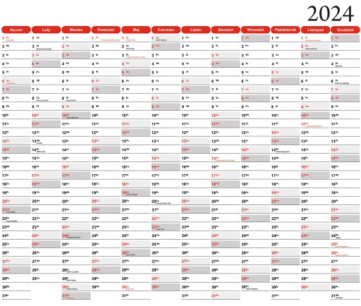 - Zaznaczone na czerwono Święta Narodowe wolne od pracy