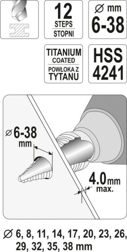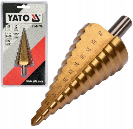 Wiertło stopniowe 6-38mm marki YATO YT-44740. Wykonane ze stali szybkotnącej HSS 4241, pokryte azotkiem tytanu. 12 stopni o średnicy: 6; 8; 11; 14; 17; 20; 23; 26; 29; 32; 35; 38mm, uchwyt walcowy.
