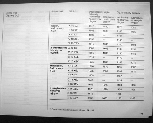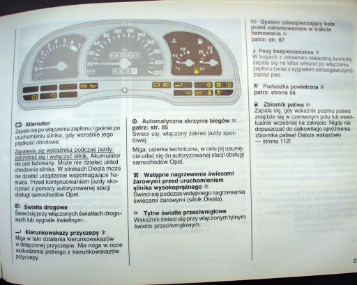 Wystawiona przeze mnie na aukcję instrukcja obsługi jest używana, napisana w języku polskim, wydana przez producenta tego samochodu Adam Opel AG Russelsheim - zawiera informacje dotyczące wszystkich wersji tych samochodów. Wydana jest po liftingu samochodu. Opisuje samochody w wersji: Hatchback 3- i 5-drzwiowy, Sedan 4-drzwiowy, Caravan, Cabrio i Samocód dostawczy. Jak każda tego typu instrukcja ma za zadanie zapoznać użytkownika ze sposobem kierowania i konserwacją samochodów oraz dostarczyć ważnych informacji z zakresu bezpieczeństwa. Gwiazdką (*) oznaczono wyposażenie, które nie jest montowane we wszystkich samochodach (różne modele, różne silniki, wyposażenie dodatkowe, różne rynki zbytu). Instrukcja dotyczy samochodów z silnikami o zapłonie iskrowym (benzynowe): typ C14NZ o pojemności 1389 cm³, typ C14SE o pojemności 1389 cm³, typ Z14XE o pojemności 1389 cm³, typ 14SE o pojemności 1389 cm³, typ X16SZ o pojemności 1598 cm³, typ 16LZ2 o pojemności 1597 cm³, typ X16XEL o pojemności 11598 cm³, typ C16SE o pojemności 11598 cm³oraz samochodów z silnikami wysokoprężnymi (diesla): typ X17DTL o pojemności 1700 cm³, typ X17DT o pojemności 1686 cm³i typ C18XEL o pojemności 1799 cm³, typ X20XEV o pojemności 1998 cm³, typ C20XE o pojemności 1998 cm³. Kartki książki są klejone na grzbiecie (nie są zszywane). Książka jest kompletna. Ślady użytkowania na okładkach, środek kompletny i czysty (patrz zdjęcia). Spis treści instrukcji na załączonych zdjęciach.