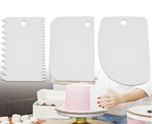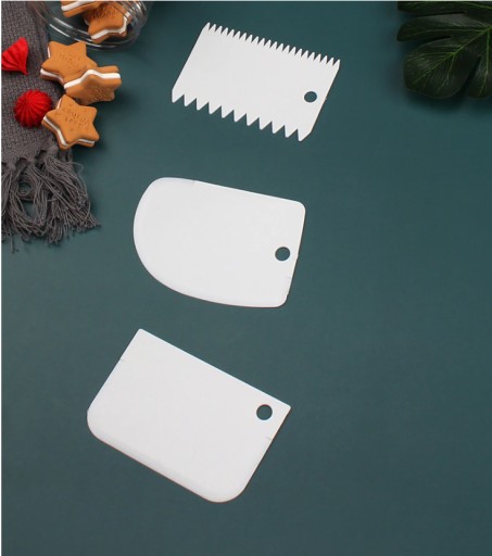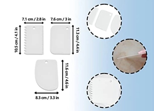 Zestaw 3 szpatułek z ząbkami do dekoracji i krojenia ciast i tortów w różnym kształcie.