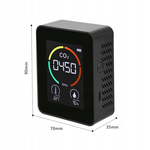 Duży ekran LCD, różne kolory czcionek wyświetlają różną jakość powietrza, zielony 400-799ppm, żółty 800-1199ppm, pomarańczowy 1200-1599ppm, czerwony 1600-1999ppm, 2000ppm powyżej czterech kolorów migają jednocześnie.