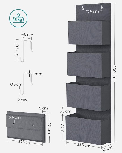 Jeśli w Twoim mieszkaniu już brakuje miejsca na szafki, ale wciąż walczysz z chaosem związanym ze skarpetkami, szalikami czy ubrankami dziecięcymi, ten wiszący organizer z 4 pojemnymi kieszeniami jest Twoim wybawieniem. Każda z kieszeni ma wymiary 32 x 10 x 17 cm, zapewniając przestrzeń, której potrzebujesz.
