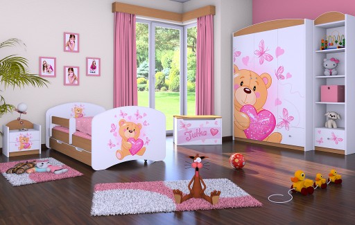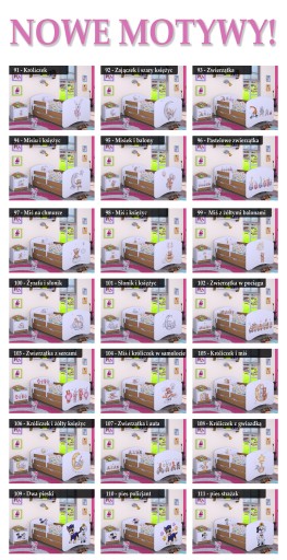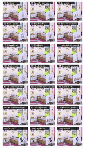 Każdy z mebli może być wykonany z motywami dostępnymi na łóżeczkach.