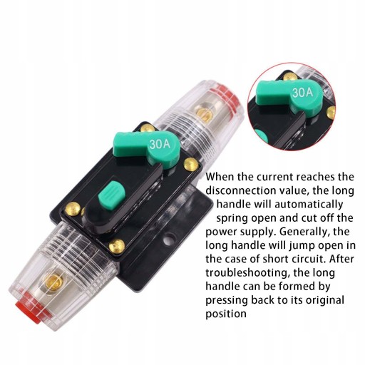 Opis: AUTOMATYCZNY: Gdy prąd osiągnie wartość poniżej wartości, uchwyt automatycznie odetnie zasilanie. Ogólnie rzecz biorąc, rozłączył się w przypadku obwodu. Po usunięciu usterki wcisnąć klamkę do tyłu. RÓŻNE PRĄDY: Wyłącznik zawiera 10A, 30A, 50A, 60A, aby spełnić różne potrzeby. MATERIAŁ: wyłącznik automatyczny jest wykonany z materiału bakelitowego, materiał bakelitowy ma wysoką wytrzymałość mechaniczną, dobre właściwości izolacyjne,. KONSTRUKCJA RESETU RĘCZNEGO: Wyłącznik automatyczny z resetem ręcznym, wyłącznik automatyczny może być używany jako główny wyłącznik obwodu, może być również używany jako rozłącznik. ZASTOSOWAŃ: Doskonały do ochrony przed przeciążeniem lub zwarciem samochodowego sprzętu audio/, łodzi, ciężarówek, wciągarek i systemów ATV.