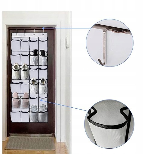 - Za pomocą dołączonych czterech metalowych haczyków pudełko na buty można zawiesić na drzwiach o grubości mniejszej niż 4,5 cm.