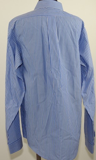 Koszula wizytowa w niebieskie paski firmy Brooks Brothers. Rozmiar z metki USA wiek 18 lat, wzrost szacowany 168/176 cm. Proszę dokładnie sprawdzać wymiary, rozmiary mogą różnić się od europejskich.