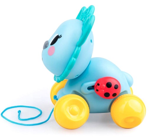 Kiedy maluch prowadzi rączką zwierzaka, ten jedzie, zabawnie kołysząc przy tym głową na boki.