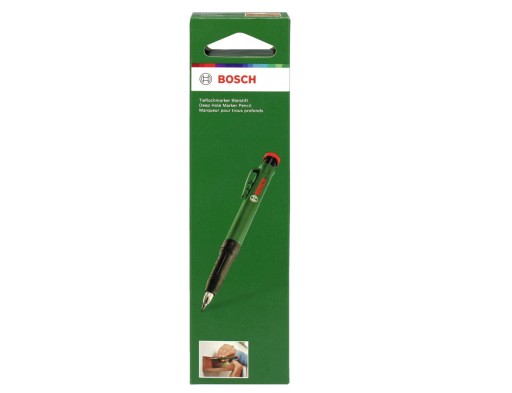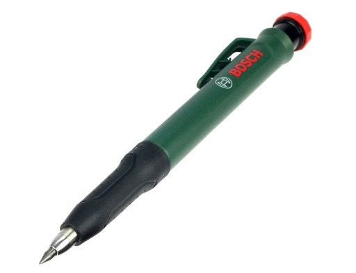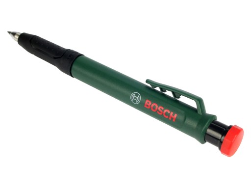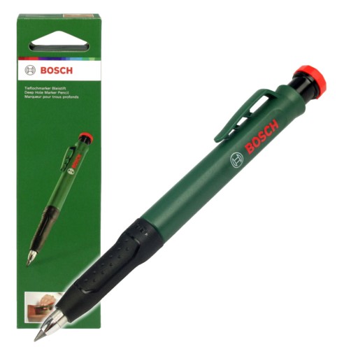 Ołówek, znacznik do głębokich otworów firmy BOSCH posiada zdejmowaną skuwkę, tak więc oprócz znakowania powierzchni płaskich, po zdjęciu skuwki może służyć do łatwego znakowania miejsc w głębokich otworach, co zwiększa elastyczność pracy.