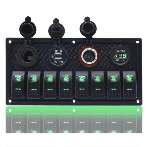 Jest to 8-przyciskowy przełącznik kołyskowy i gniazdo/gniazdo zapalniczki/gniazdo USB/woltomierz.
