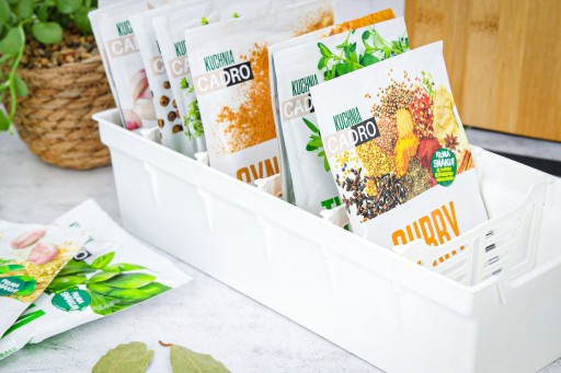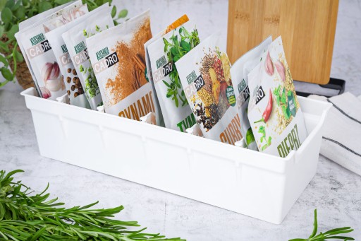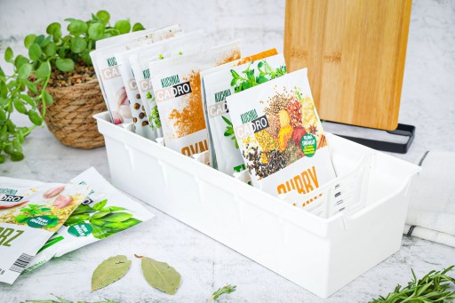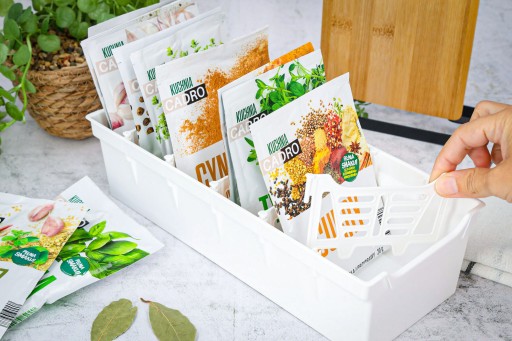 ✅ Praktyczny - Pojemnik ułatwia przechowywanie przypraw w jednym miejscu. Wyposażony jest w wyjmowane przegródki oddzielające torebki od siebie.