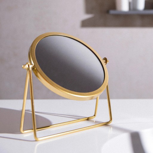 Lusterko ESPELLO wykonane jest z metalu i szkła. Złota, metalowa ramka i podstawa posiadają gładką fakturę. Tafla lustra jest gładka, bez zbędnych wzorów, które zasłaniałyby obraz. Lusterko jest szerokie, dzięki czemu masz możliwość zobaczenia w jego odbiciu całej swojej twarzy, a dzięki temu, że możesz dowolnie nim obracać, wykonasz perfekcyjny makijaż. Produkt jest lekki i dobrze leży w dłoni, dzięki czemu łatwo przeniesiesz go w najlepiej ośweietlone miejsce.
