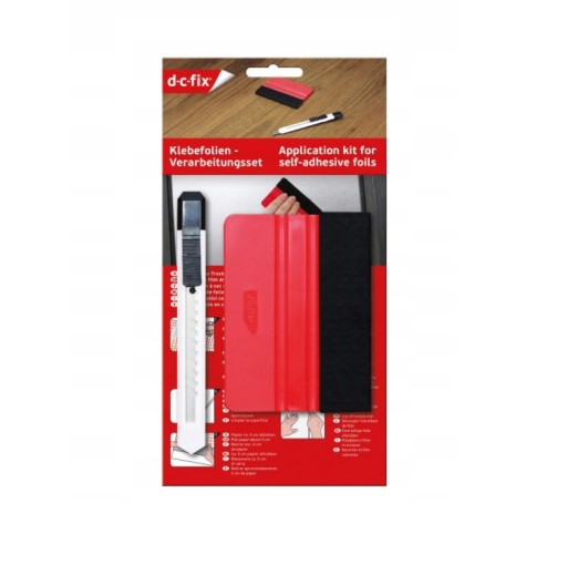 Profesjonalny zestaw montażowy marki D-C-fix do przyklejenia okleiny meblowej, folii statycznej lub folii samoprzylepnej. W skład zestawu wchodzi rakla pokryta z jednej strony filcem oraz nożyk.
