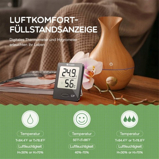 Dzięki czytelnemu, widocznemu na pierwszy rzut oka wyświetlaczowi higrometr Habor mierzy wilgotność w pomieszczeniu i temperaturę w pomieszczeniu na czas, pomagając dostosować nawilżacz, ustawienia osuszacza i higrostat, doskonale nadając się do monitorowania warunków życia i zdrowia rodziny zapobiegając przeziębieniom, wysuszeniu skóry, astmie, alergii, pleśni. Możesz także określić, w co się ubrać na dany dzień, na podstawie odczytów temperatury i wilgotności, monitorować swoje zdrowie 24 godziny na dobę, poprawiać jakość życia, zdrowie jest najważniejsze!