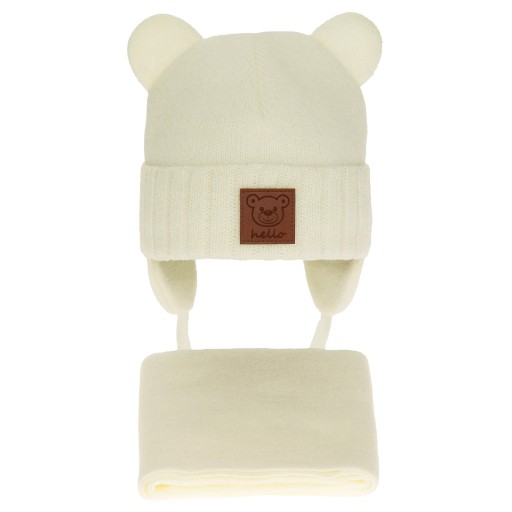 Cieplutki i niezbędny w zimowej szafie niemowlaka komplet zimowy - czapka i szalik kolorze kremowym.
