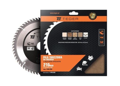 Piła tarczowa do drewna z węglikiem spiekanym 210x30x60T / TEGER przeznaczona do cięcia wzdłużnego i poprzecznego drewna litego, sklejki, płyt wiórowych, płyt laminowanych i MDF, materiałów drewnopodobnych i kompozytowych. Zęby widiowe z węglikiem spiekanym zapewnia długą żywotność tarczy przy intensywnej pracy.