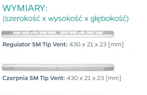 Nawiewnik ma bardzo delikatny wygląd. Wymiary regulatora i czerpni: 430 x 21 x 23 mm.